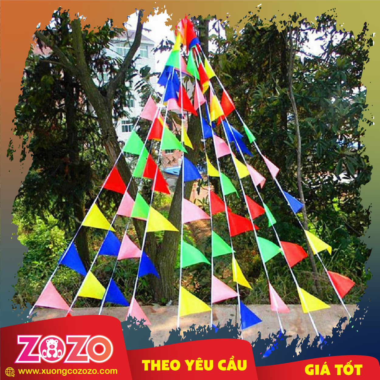 Tại ZOZO, cờ dây tam giác được làm từ chất liệu nhẹ, bền màu, đường may chắc chắn, bay đẹp ngay cả khi treo ngoài trời. Bạn có thể tùy chọn kích thước, màu sắc hoặc in logo, thông điệp riêng để phù hợp từng sự kiện hay không gian.